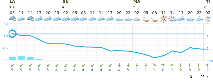 huomiseen yöhön asti: tuuli 5.5 m/s, heikkoa lumisadetta, pilvistä.